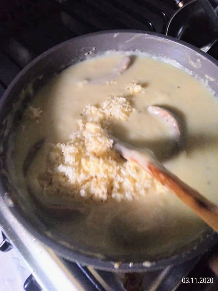 Ketiga, ibu saya membuat saus keju yang ditambahkan dengan keju yang saya parut tadi, setelah itu saya membantu ibu saya mengaduk tanpa henti untuk menjaga saus keju tidak gosong.