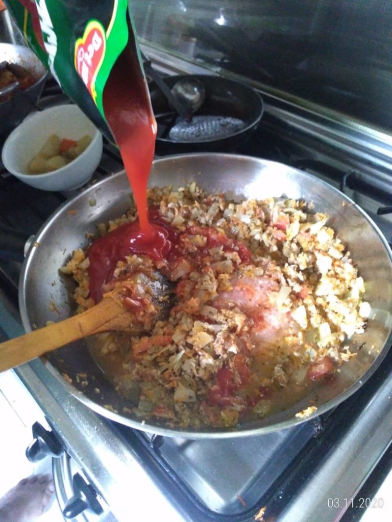 Dan setelah itu Ibu saya menggabungkan bahan-bahan yang saya potong tadi dengan daging yang selesai diblender untuk membuat isian lasagna.