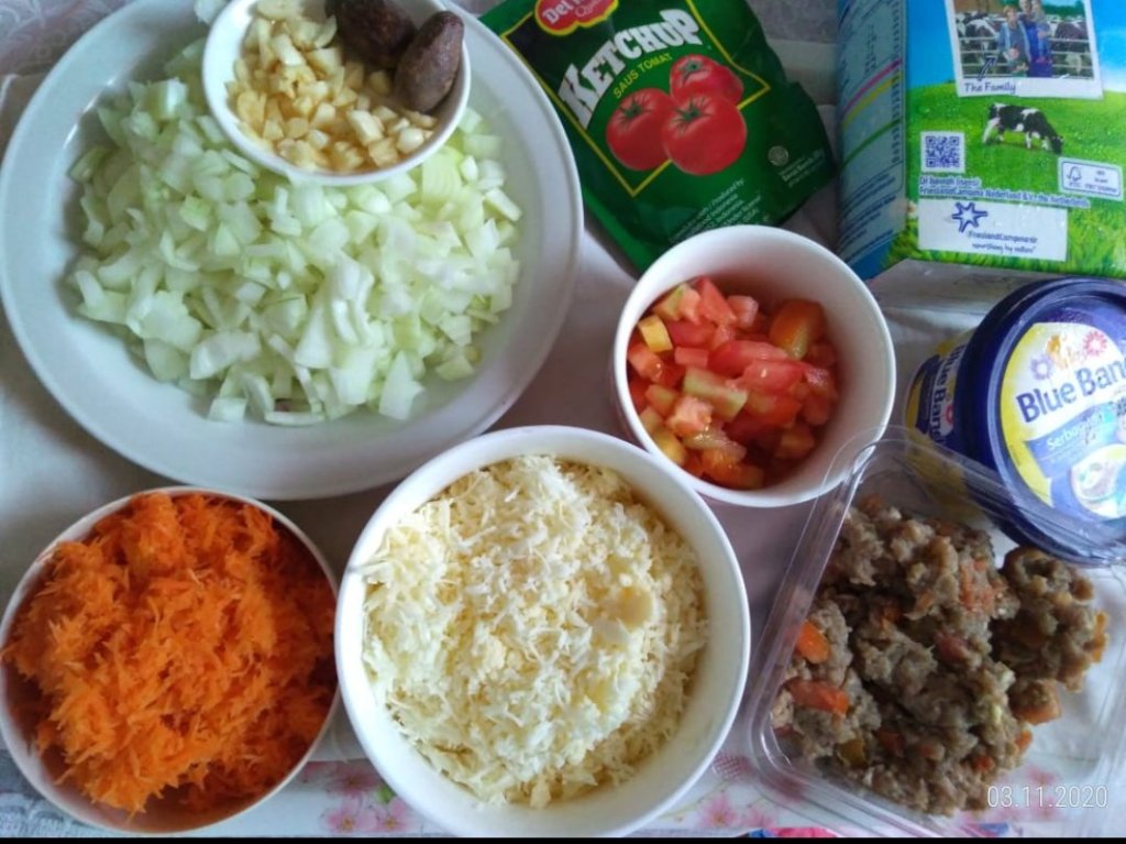 Pertama, saya memotong bawang putih, bawang bombai dan tomat menjadi dadu-dadu, setelah itu saya memarut wortel, setelah itu saya memarut keju untuk saus keju dan sebagai hiasan.